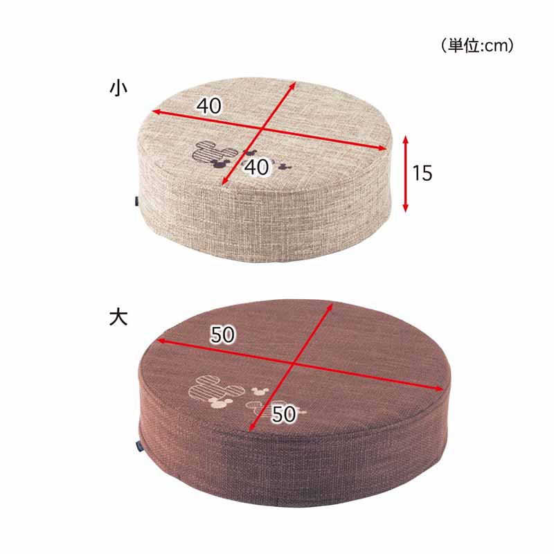 ■小/幅40、奥行40、高さ15cm ■大/幅50、奥行50、高さ15cm ●主材/カバーリング側地:レーヨン、ポリエステル、中身:チップウレタンフォーム、低反発ウレタンフォーム ●日本製 (C)Disney ※カバーのみ洗濯機で洗えます。
